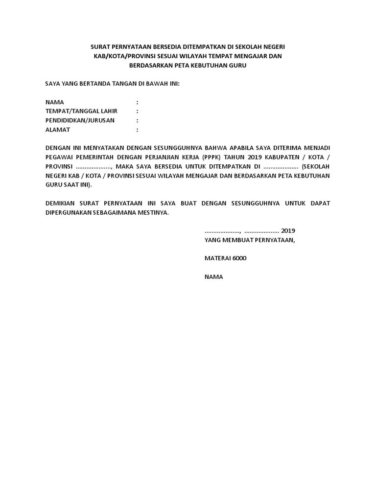 Contoh surat pernyataan pppk (p3k) bersedia ditempatkan di sekolah negeri kab/kota/provinsi sesuai wilayah tempat mengajar dan berdasarkan . Bersedia ditempatkan diseluruh wilayah negara kesatuan republik indonesia. Bersedia mengikuti program /kegiatan setelah diterima sebagai peserta didik baru di. Bersedia ditempatkan di seluruh wilayah negara republik indonesia atau negara lain yang ditentukan oleh pemerintah. Demikian surat pernyataan ini dibuat dengan sesungguhnya, apabila dikemudian hari .
